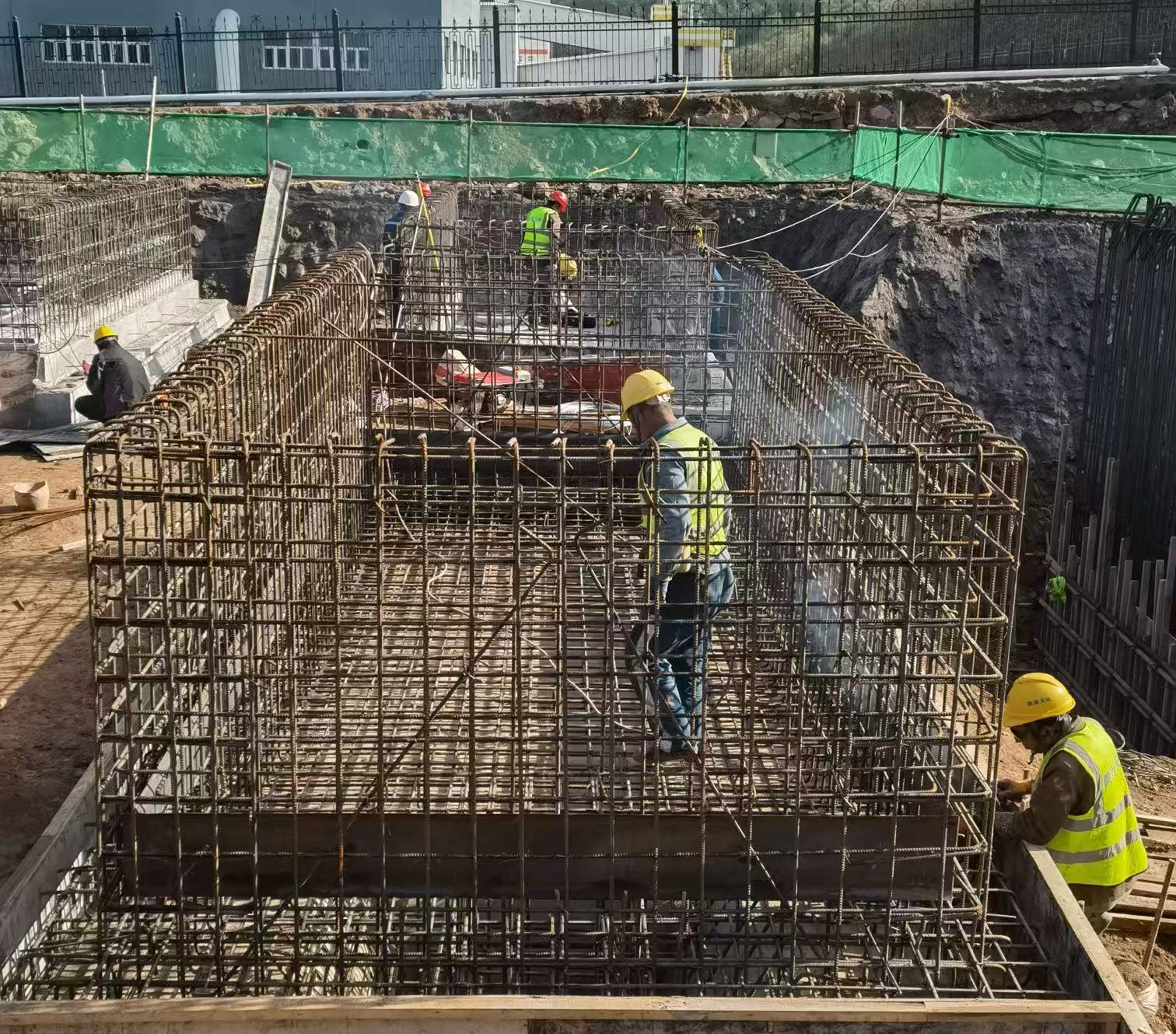 在有效应对天气影响的同时,项目团队配备挖掘机、吊车等10余台设备,全面铺开作业面,#1、#2飞轮舱基础实现从放线验收到钢筋加工、绑扎全流程闭环,飞轮及电池PCS一体机基础完成钢筋绑扎、止水板焊接、模板支护及基础浇筑,#3、#4飞轮舱基础完成墙模板支护、螺栓预埋、举牌验收及基础浇筑有序推进。
