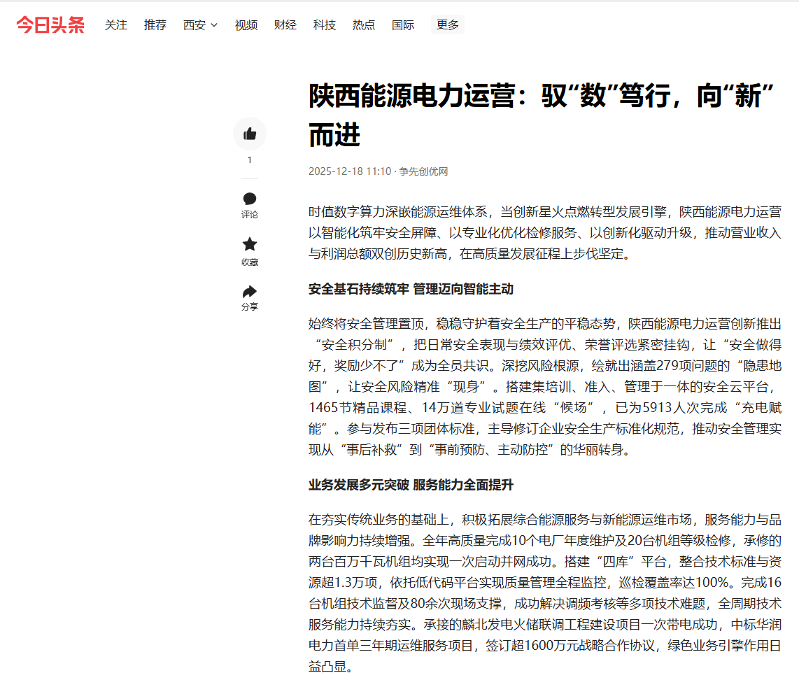 时值数字算力深嵌能源运维体系,当创新星火点燃转型发展引擎,陕西能源电力运营以智能化筑牢安全屏障、以专业化优化检修服务、以创新化驱动升级,推动营业收入与利润总额双创历史新高,在高质量发展征程上步伐坚定。