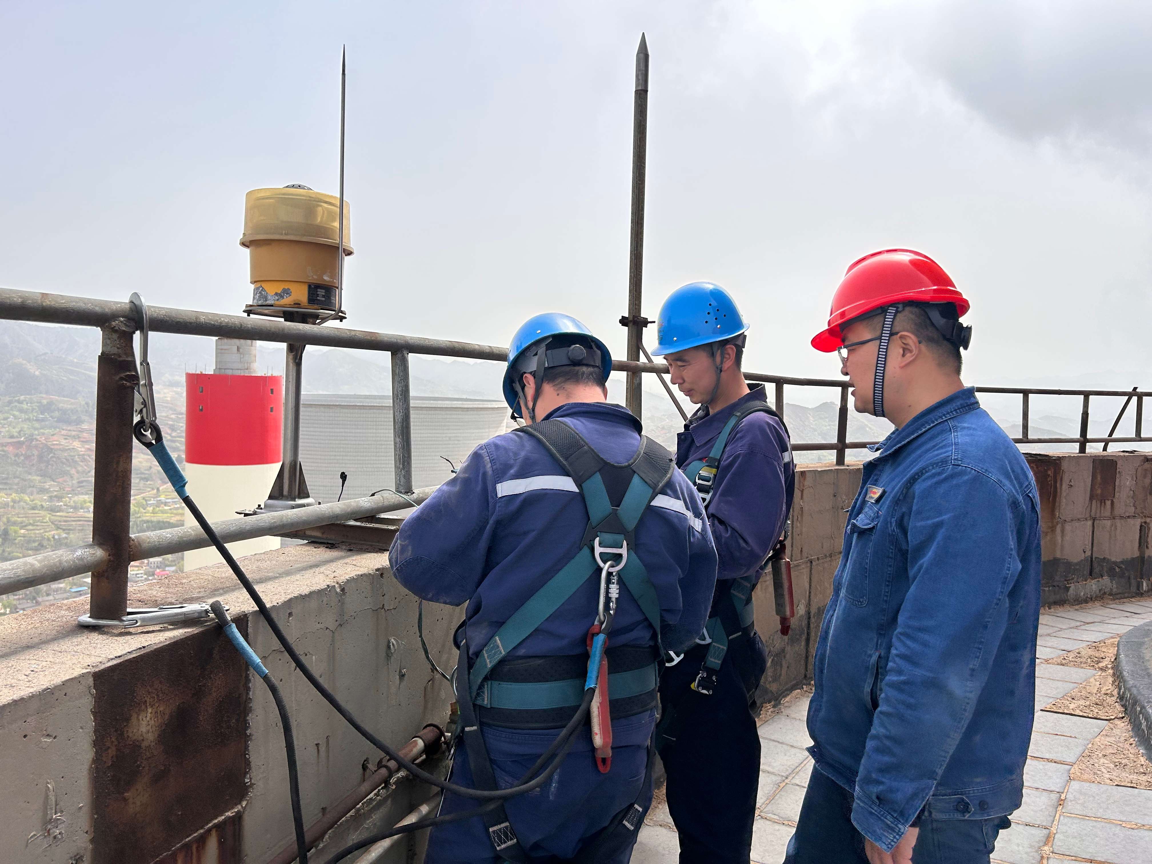 尽管地面已是春意融融,但烟囱顶端依旧寒风刺骨,原有航标灯长期受高空强风与日晒雨淋侵蚀,出现老化衰减,存在安全隐患。商洛项目部提前制定施工方案,明确作业流程、安全细则及人员分工,并备齐备品备件与防护装备。此次作业难度高、风险大,对人员体能、技术和心理素质提出了极高要求,登塔前项目部认真开展安全技术交底,逐一检查登高防护装备,对新航标灯进行地面测试,确保设备状态良好。